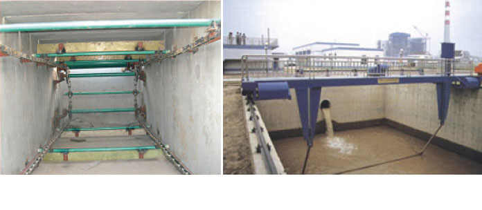 減速驅(qū)動裝置通過鏈輪付將動力傳遞于牽引鏈帶動刮板沿池內(nèi)上下軌導(dǎo)作定向回轉(zhuǎn)連續(xù)運行,運行過程中刮板將池底泥沙、池面油渣不斷分別刮集于集泥槽、排渣管排出池外。